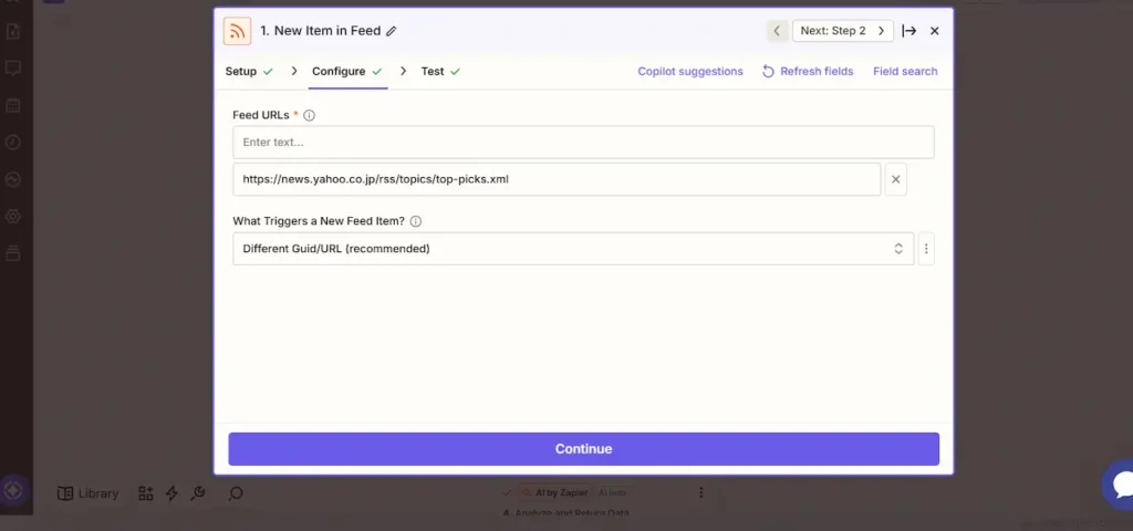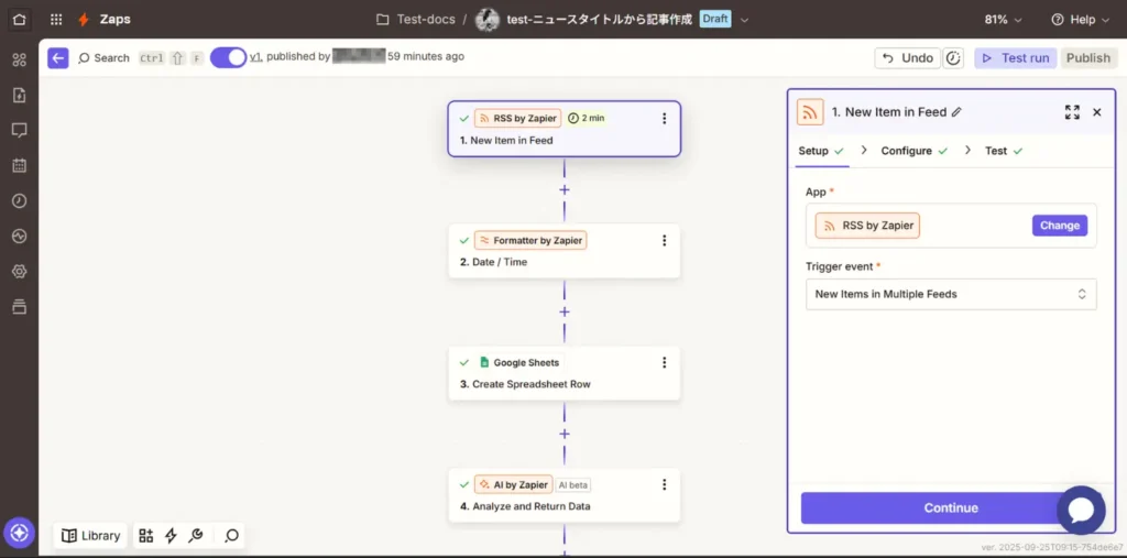 ZapierにRSSアプリを追加し、任意のサイトのRSS URLを入力すれば、新着記事を検知できるようになります。