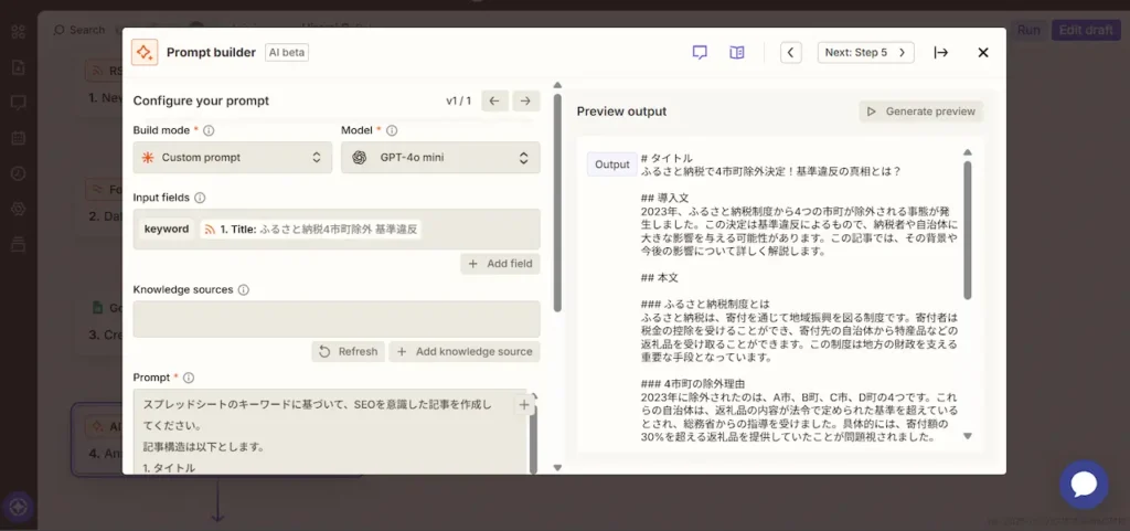 [Generate preview]ボタンを押すと、テスト対象となったキーワードからテンプレートのプロンプトに従って右側のOutoutに記事が生成されます。