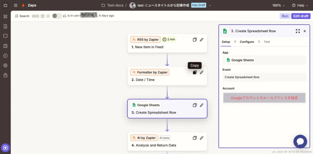 Account:Zapierに登録したメールアドレス(Googleアカウント)を指定します。
