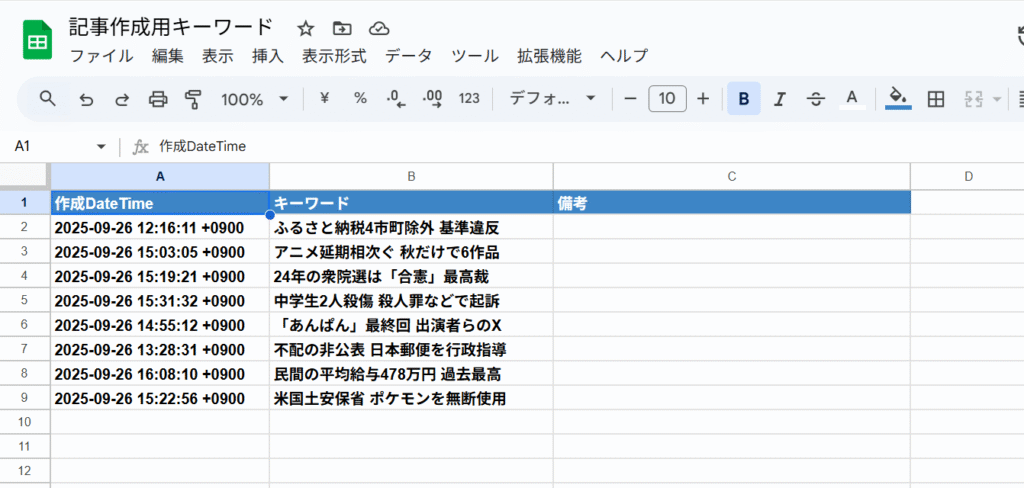 Google Spreadsheetに出力されたニュースタイトル