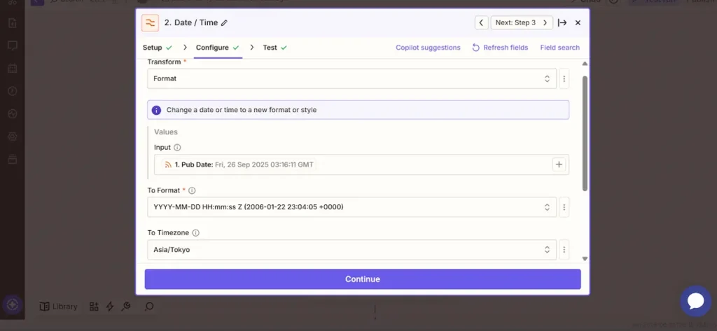 取得したい日付(Pub Date)を指定し、希望するフォーマットとタイムゾーンを選択します。