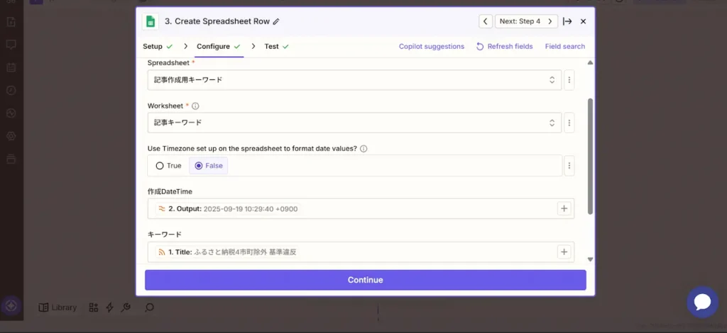3. Googleスプレッドシートに保存(Create Spreadsheet Row)